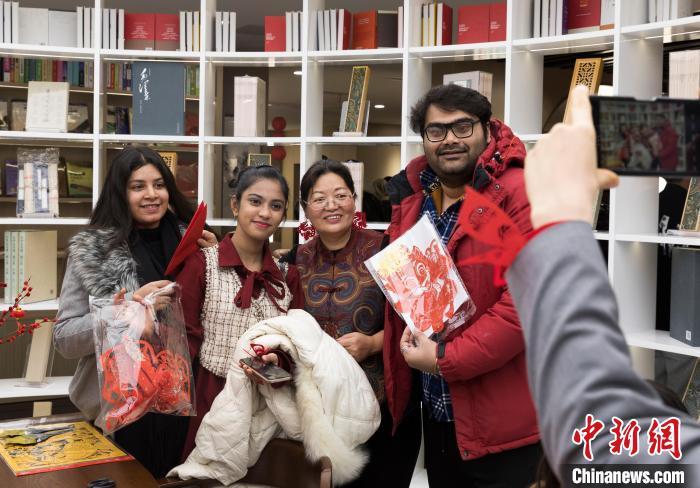 异邦留学生与剪纸教化合影贪恋。中新网记者 杨迪 摄